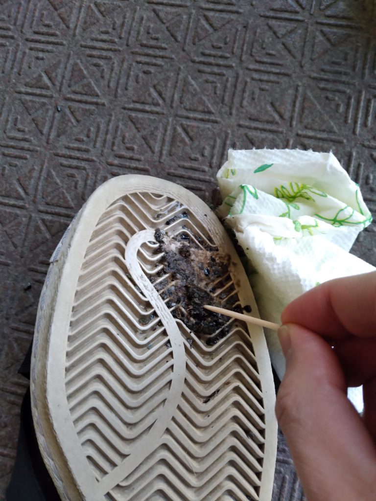 ガムが靴底に貼りついて時間が経ち、砂だらけになっています。このようなガムもこの方法で取れます。